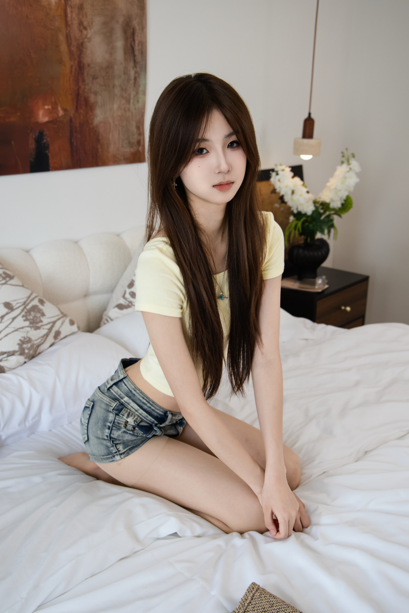 搭配内容:黄色短T、牛仔短裤、肉色丝袜、裸色高跟鞋