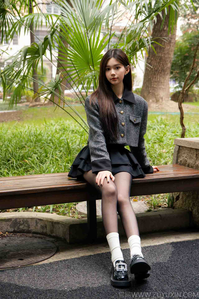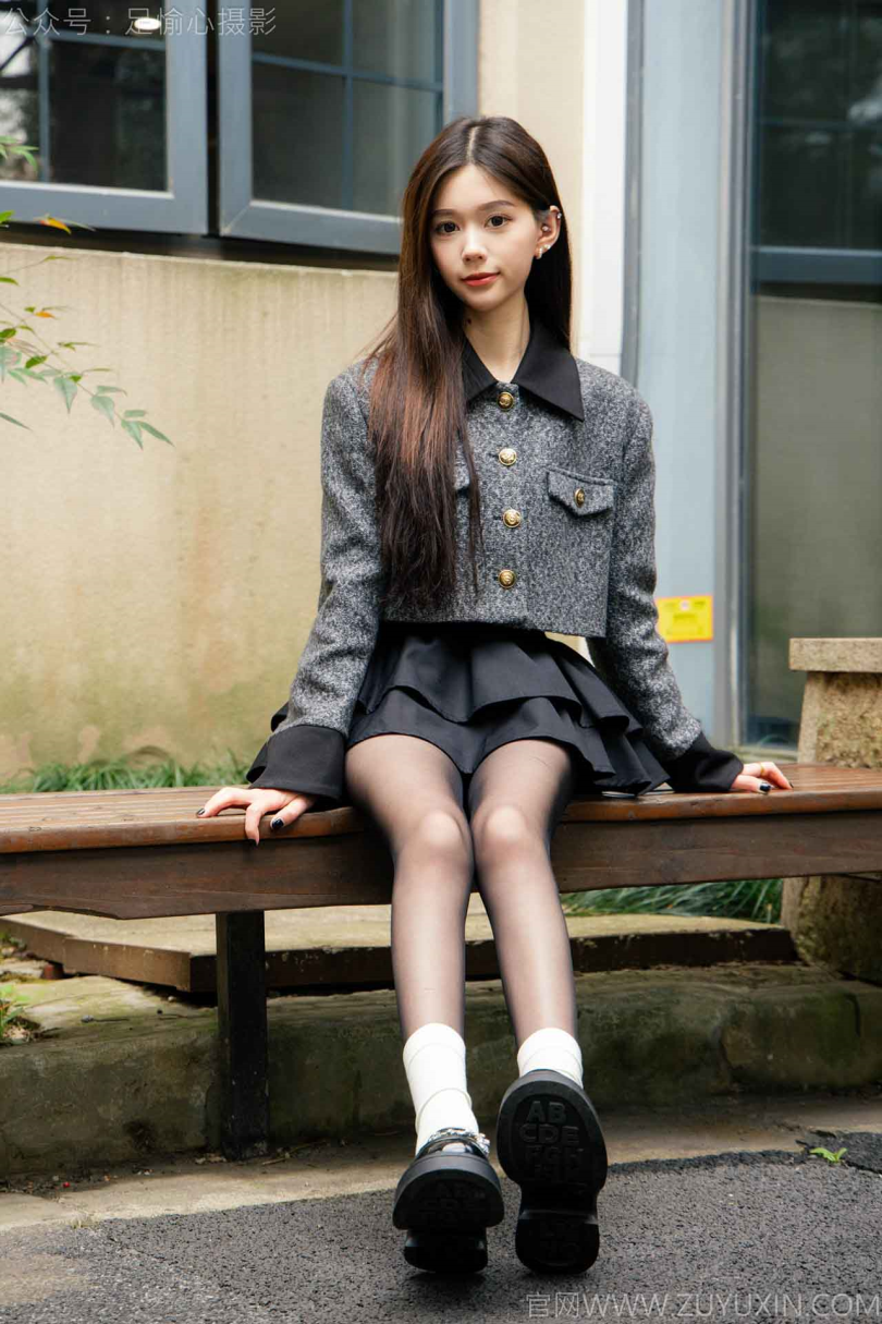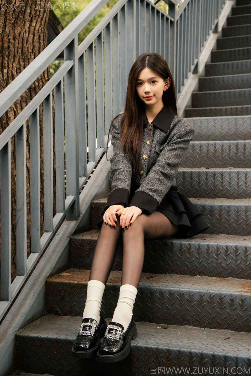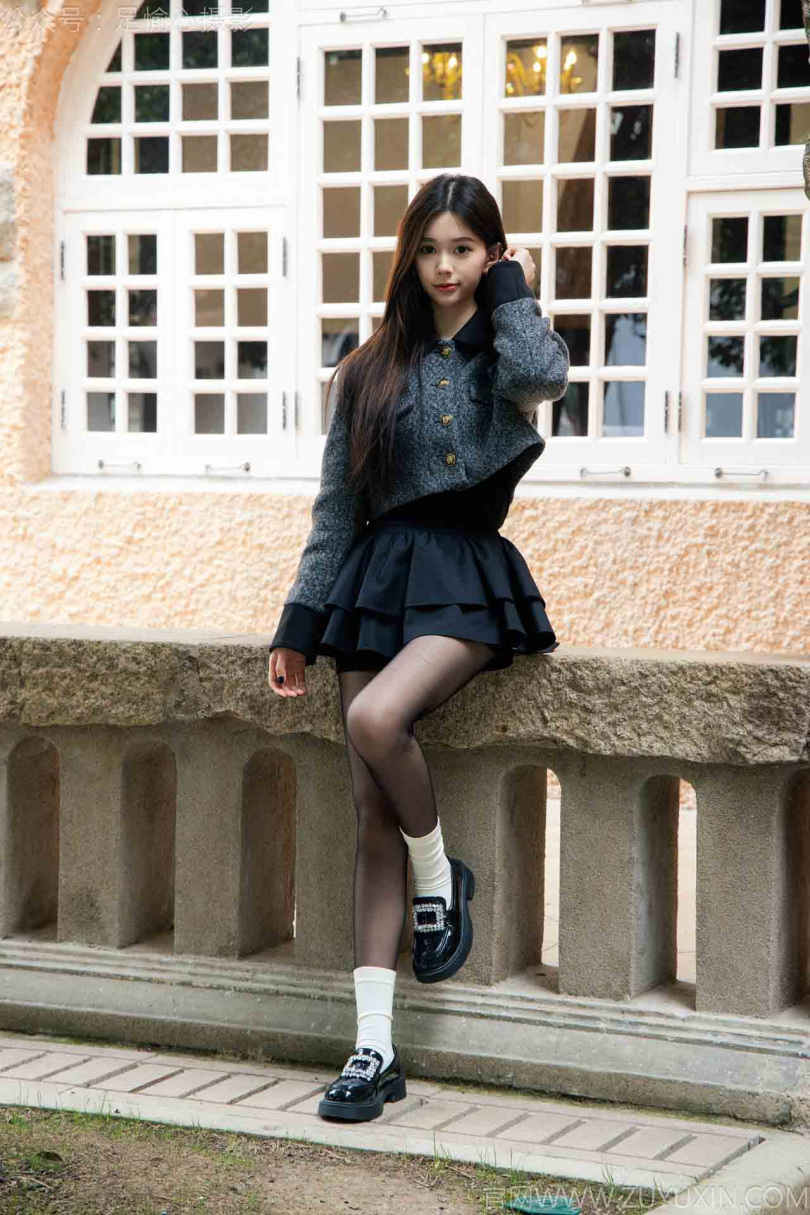 搭配内容:灰色外套、黑色短裙、黑色皮鞋、黑色丝袜、白色棉袜