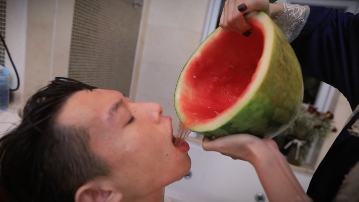 之后芷晴拿出半个西瓜,用脚踩碎西瓜并喂给m吃,接着往西瓜瓤里接满圣水,混合着洗脚的西瓜汁,强制灌进m的嘴里让他全部喝进肚子里...