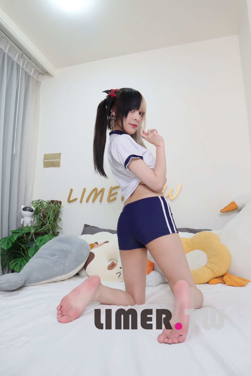 小愛穿著簡單的日本體育服,赤裸的雙足輕輕踩在床上,隨意地展現出她的青春與活力。